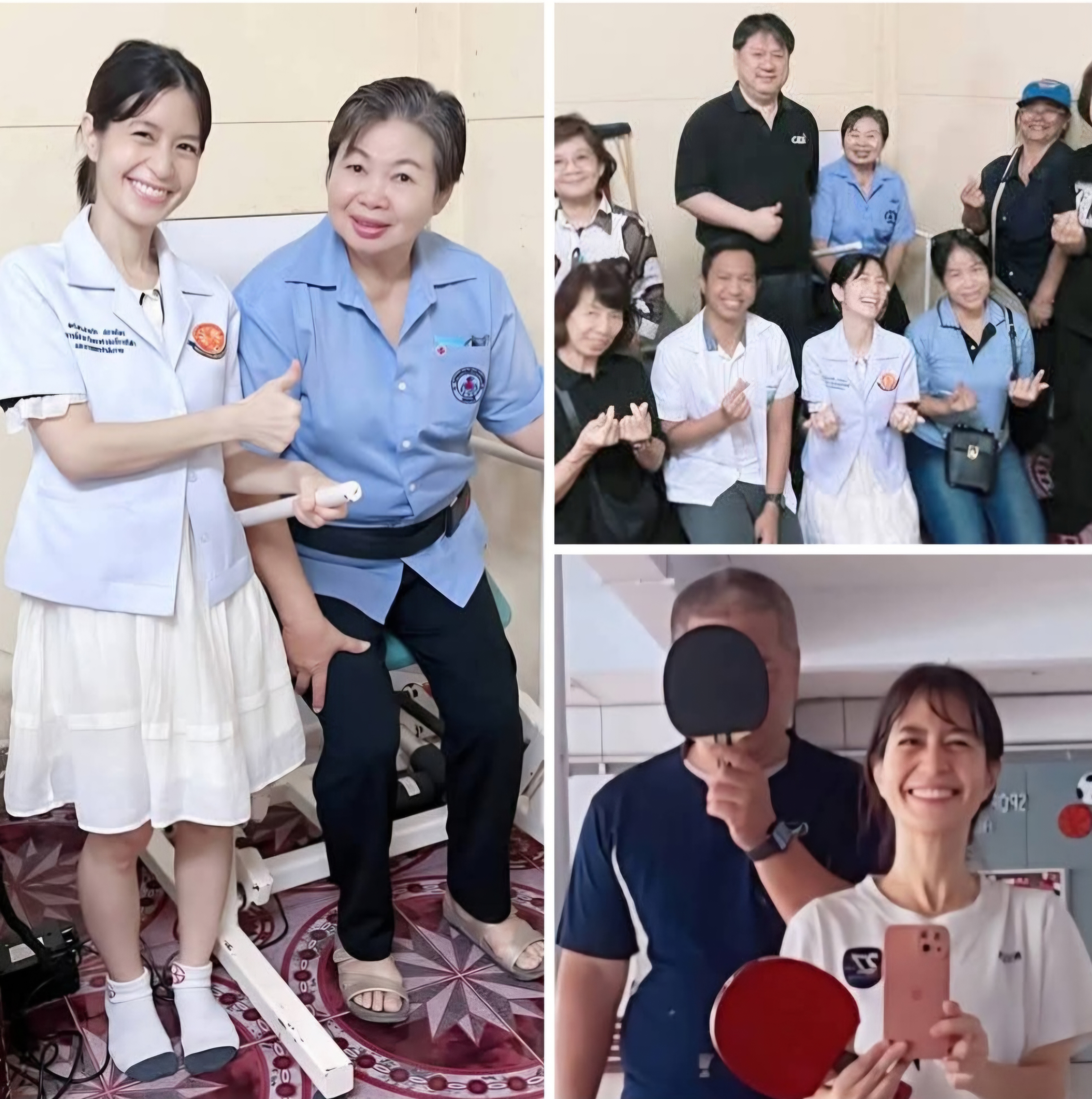 Thailand peace sports global leader Prof./Dr.Sairag Saadprai (Thammasat University) assists the handicapped elderly with stand trainer machine while enjoying table tennis during her leisure time.
